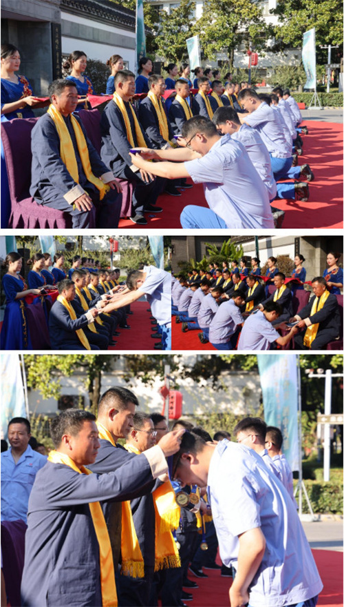 “一拜感念師恩,傳承匠心;二拜技藝超群,通古博今;三拜傳承酒脈,報國為民?!薄蠛尤酥貛煹?,尊師道,以弦歌不輟、薪火相傳的精神,表達對綿柔品質的不懈追求,師徒間的情誼在拜師儀式中建立、沉淀,既有同事間的相互合作,也有前輩對后輩的幫扶。